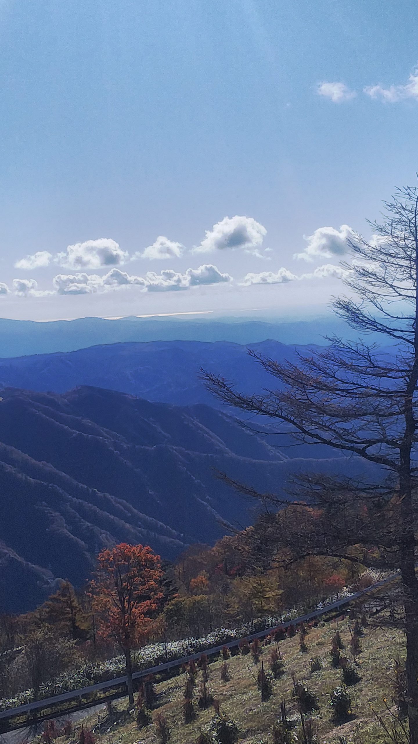 爽やかな秋の日でした。紅葉とこもれ日は寒原峠です。残りの写真は高嶺山からの景色です。車で上がれます。絶景です‼️天気がよく雲が少ないと遠くにうっすら海が見えます。歩いても上がれます。遊歩道もあり1日で往復可能です‼️
